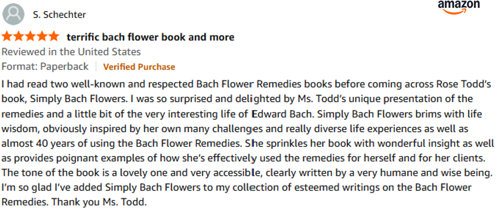"I've had read 2 well-known and respected Bach Flower Remedies books before coming across Rose Todd’s book, Simply Bach Flowers. I was so surprised and delighted by Ms. Todd’s unique presentation of the remedies and a little bit of the very interesting life of Edward Bach.